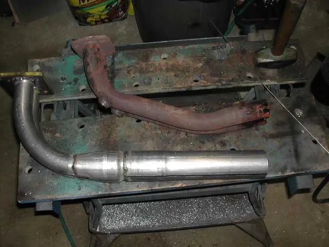 The very first pipe in the system is not stainless. Not that stainless wasn’t my preference but I couldn’t locate stainless mandrel bends in 1.75″ pipe in time. The original twin header pipe was made of 1 and 5/8th tubing and there was just enough room to up that to 1 and 3/4″ and still get it down between the engine and the frame. The flange to the intake was cut from 3/8″ steel plate and the twin pipes merged into a single 2 and a 1/2″ pipe and ended at a stainless three bolt flange. There are two O2 sensor bungs in the collector, one for the car’s O2 sensor and a second for the dyno’s sensor. The flanges were custom cut by Harbor Propeller of Cundy’s Harbor, Maine. As it turned out we didn’t use the dyno bung. From there back it was simply a matter of fitting and welding.