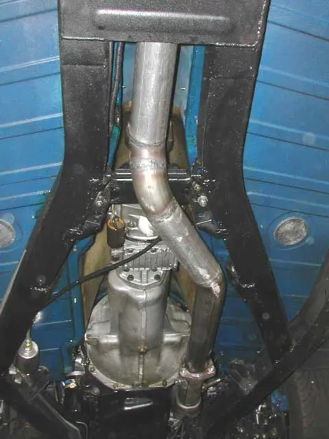 Using 2 and 1/2″ pipe is about the max that will fit and it does hang down a tad as it goes under the overdrive mount. Got to think that 2.25″ tubing would suffice in most instances. Anyway there is a splice in the system just past the differential joined by a band clamp. Between the band clamp and the flange at the rear of the header, the pipes can be easily disassembled.