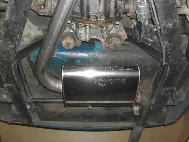 The muffler started out as a Dynomax Ultra Flow and had it’s spouts trimmed way back in order to make the very tight bends. Ultra Flow is a perfect description of this muffler as you can look right thru it and drop tennis balls right thru. The tailpipe exits at the left rear corner heading straight back. It’s been left a bit long as the old system used to give me a whiff of exhaust at times. No fumes from this set up.