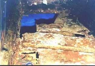 Carpets sure can cover a multitude of sins! Peeling them back revealed serious rust problems. This photo is the driver’s side floor looking forward. The blue in the photo is a blue tarp laying on the garage floor! Fred Flintstone would be right at home driving this car.