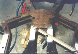 The white paint ahead ahead of the trailing arm sections was done so I could make reference marks to locate the new frame members. The angle iron is clamped exactly parallel to the old section.