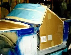 This car originally was painted Delft Blue. It was my intention to change the color to something flashier like a bright red or even a yellow but my better half liked the blue. So blue it is. NAPA listed Delft Blue and all the Triumph colors and their formulas. They have the formulas in acrylic enamel and several other paint types but nothing listed in a Tec Base type. Acrylic enamel delft blue formula is 99-22158. While doing the trunk, I primed a piece of cardboard and gave it two coats of delft blue acrylic enamel. NAPA scanned this sample with a spectrometer and came up with a formula for Tec Base, 98-60257. It turns out that this same Tec Base formula is used by Mack truck!