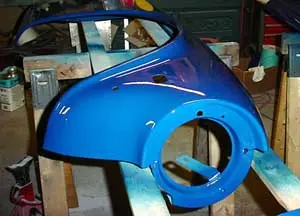 The urethane primer on the outside will be block sanded until all panel imperfections have been addressed. Outside and inside will get two coats of urethane primer/sealer (Martin Senour). Both sides will get a base coat/clear coat finish (Tec Base). Base coat/clear coat is a very high end modern finish not originally used by Triumph. Two coats of base dry to a nearly flat finish. Two more coats of clear bring out the shine. The finish dries hard and can be buffed for even more shine. I have enough base/coat clear coat materials on hand to do both sides this way but my original thought was to use a regular primer/sealer (NAPA Crossfire CS279) on the inner sides and finish them with acrylic enamel.