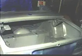 The trunk area was cleaned, derusted, and repaired. Bare areas were primed with an etching primer (Martin Senour 7220 spray can). Then the entire trunk area was primed with with a primer/sealer (Martin Senour Crossfire CS279).