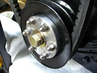 The fan eliminator is a replacement for the original cast iron fan spacer. Machined from a billet of aircraft aluminum (6061), it is stronger and far lighter than the original. Testing the aluminum retainer for distortion was done by actually over-torquing the retainer bolt to more than 150 ft lbs, the max rating for my torque wrench. Other than a mar from the lock washer, no damage at all was done to the retainer.
